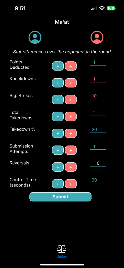 Determine how the end of an MMA round would be judged! By adding each corner’s advantages over 8 different MMA metrics in the round, users can determine how a round should be judged from a purely technical scale.